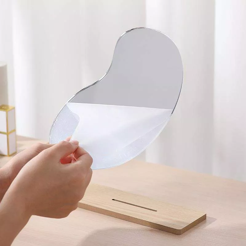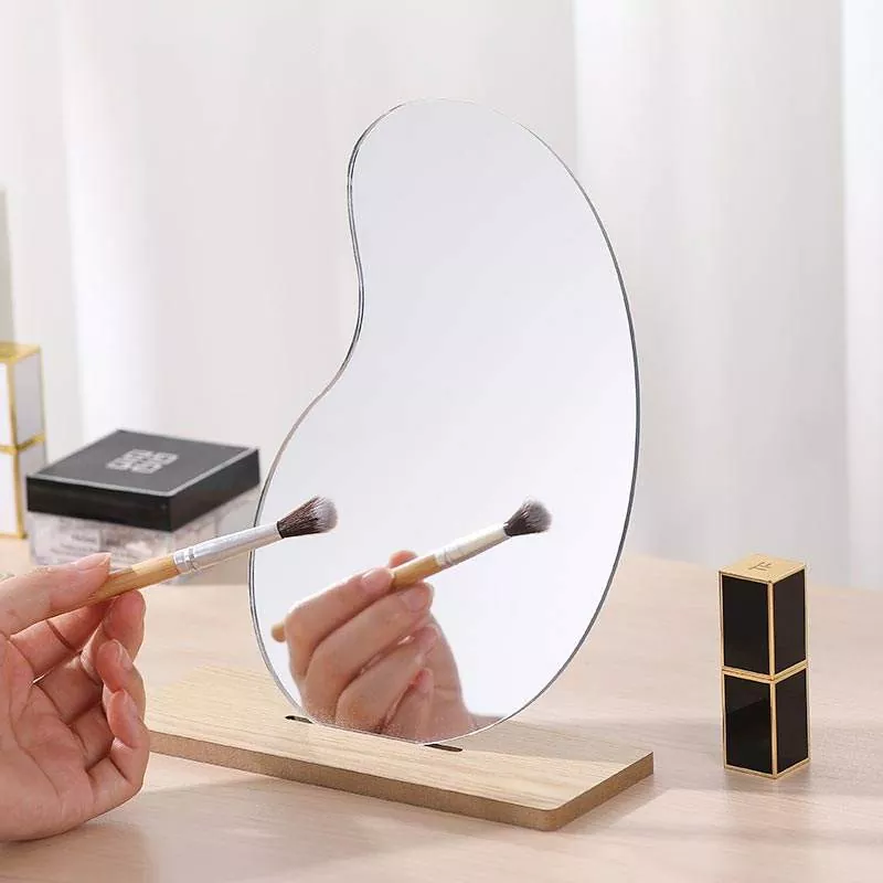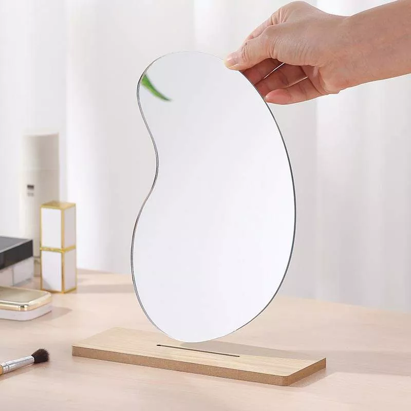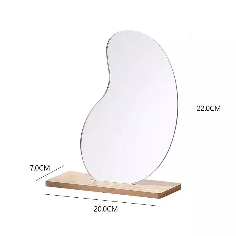 Ово неправилно таласасто стоно огледало има минималистичку, уметничку силуету која се неприметно уклапа са модерним кућним декором. Направљен од прозирног стакла високе дефиниције и глатког дрвеног постоља, пружа рефлексију без изобличења, идеалну за наношење шминке, рутине за негу коже и свакодневну негу.